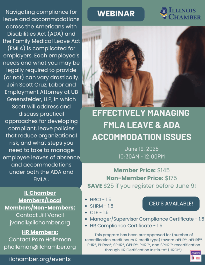 « All Events This event has passed. Effectively Managing FMLA Leave & ADA Accommodations June 19 @ 10:30 AM - 12:00 PM $175 « Seven Steps to Service Excellence Protecting Your Business in the Wake of Bad “Press” and Negative Social Media » If interested in registering for this event, click here or on image below. Add to calendar Google Calendar iCalendar Outlook 365 Outlook Live Details Date: June 19 Time: 10:30 AM - 12:00 PM Cost: $175 Website: https://lp.constantcontactpages.com/ev/reg/tv5ykht?source_id=85488ed3-703a-4208-a10d-229ad59783b8&source_type=em&c=tDJKwpBQR9M0n4Qv9OM1i6z1mFxz0VDwmFBYK3DeUmw6o7EMeuZWTQ== Organizer Illinois Chamber of Commerce Venue OnLine