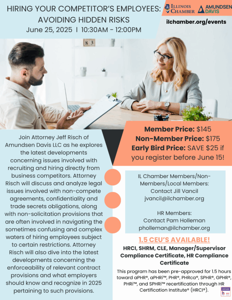 « All Events This event has passed. Hiring Your Competitor’s Employees: Avoiding Hidden Risks June 25 @ 10:30 AM - 12:00 PM $175 « Protecting Your Business in the Wake of Bad “Press” and Negative Social Media Economic Development Network: AI and Data Centers » If interested in registering for this event, click here or on the image below. Add to calendar Google Calendar iCalendar Outlook 365 Outlook Live Details Date: June 25 Time: 10:30 AM - 12:00 PM Cost: $175 Website: https://lp.constantcontactpages.com/ev/reg/qnkuat7?source_id=85488ed3-703a-4208-a10d-229ad59783b8&source_type=em&c=tDJKwpBQR9M0n4Qv9OM1i6z1mFxz0VDwmFBYK3DeUmw6o7EMeuZWTQ== Organizer Illinois Chamber of Commerce Venue OnLine