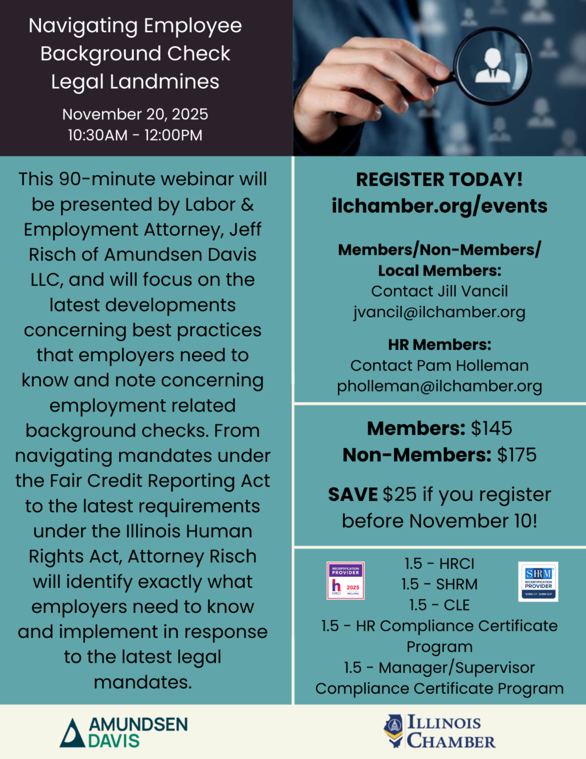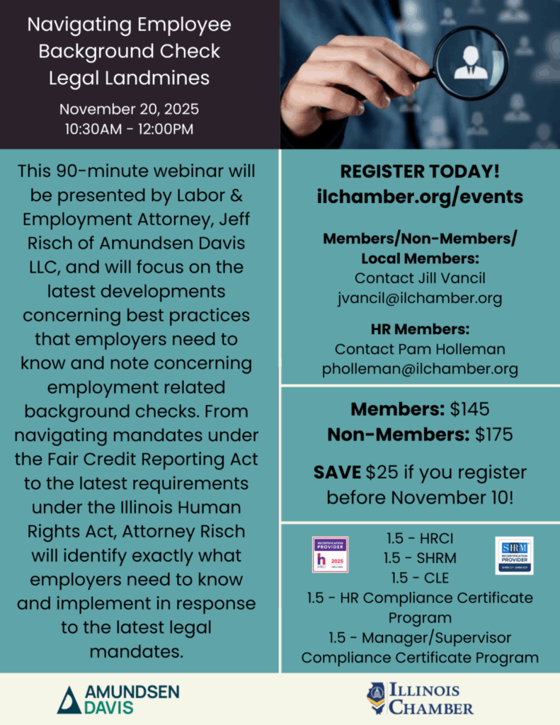 This 90-minute webinar will be presented by Labor & Employment Attorney, Jeff Risch of Amundsen Davis LLC, and will focus on the latest developments concerning best practices that employers need to know and note concerning employment related background checks. From navigating mandates under the Fair Credit Reporting Act to the latest requirements under the Illinois Human Rights Act, Attorney Risch will identify exactly what employers need to know and implement in response to the latest legal mandates.